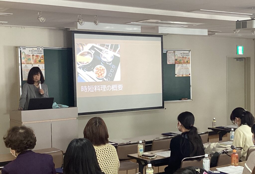特別講演には、女子栄養大学短期大学部の豊満美峰子教授をお招きし、「授業に役立つ時短調理を考えよう!」をテーマにお話しいただきました。現場で実践できる調理の工夫や授業への取り入れ方が紹介され、参加された先生方が熱心にメモを取る姿がとても印象的でした。